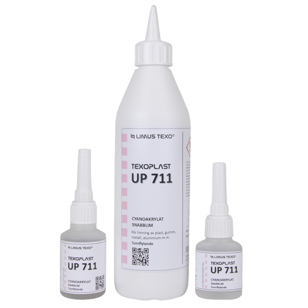 TEXOPLAST UP711 är ett snabbhärdande Cyanoakrylatlim som härdar mellan 2-15 sek. beroende på vilket material som limmas samt beroende på temperatur och på omgivningens miljö. Uppnår 90% av full styrka inom 10 min. och fullt uthärdat på 16 tim. Viskositet 40 cP. Viskositeten är dynamisk och ökar under lagerhållning. Spaltfyllnad max 0,05-0,10mm. UP711 har ingen fixeringstid utan det nyper fast nästan direkt. Inte spaltfyllande. Limmar med hög hållfasthet.