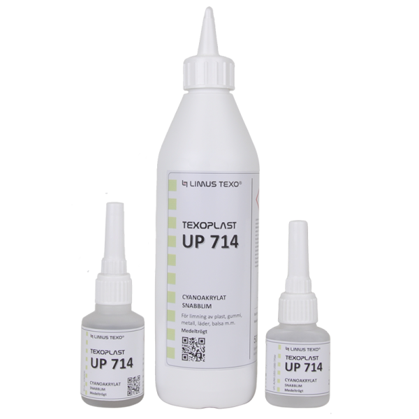 TEXOPLAST UP714 är ett snabbhärdande Cyanoakrylatlim som härdar mellan 10-60 sek. beroende på vilket material som limmas samt beroende på temperatur och på omgivningens miljö. Uppnår 90% av full styrka inom 10 min. och fullt uthärdat på 16 tim. Viskositet 600 cP. Viskositeten är dynamisk och ökar under lagerhållning. Spaltfyllnad max 0,2-0,3mm. UP714 har en viss fixeringstid innan det nyper fast när du utsätter det för hård press. Lätt spaltfyllande på grund av den lite tjockare konsistensen. Limmar med hög hållfasthet.